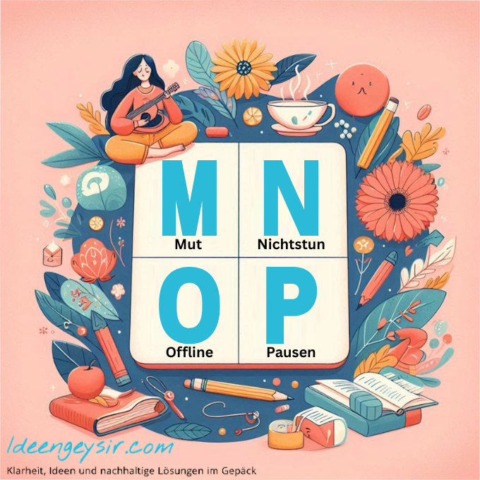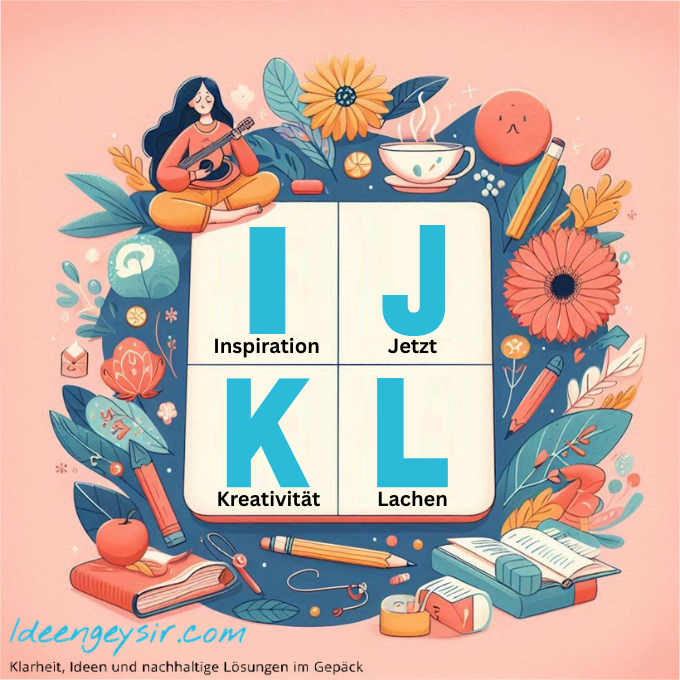 Inspiration, Jetzt, Kreativität, Lachen, Mut, Nichtstun, Offline, Pausen – acht Buchstaben, acht Möglichkeiten, das eigene Glück neu zu entdecken. Jeder Impuls ist eine Einladung, deinem Leben mehr Tiefe, mehr Leichtigkeit und mehr Verbundenheit zu schenken.